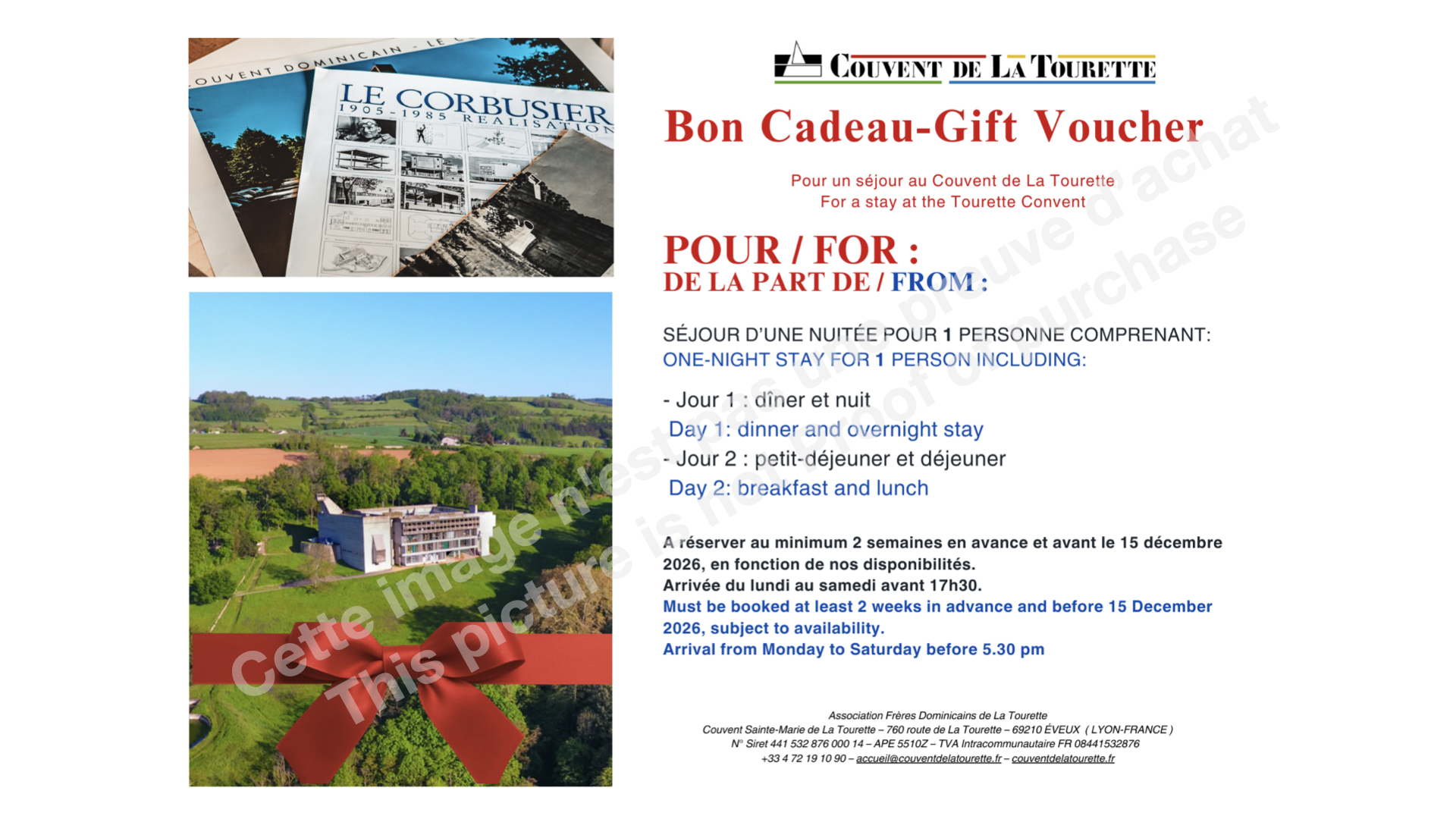 Bon Cadeau pour un séjour au Couvent de La Tourette : 1 dîner, 1 nuit avec petit-déjeuner et déjeuner du lendemain pour 1 personne | Gift voucher for a stay at the Couvent de La Tourette: 1 dinner, 1 night with breakfast and lunch the following day for 1