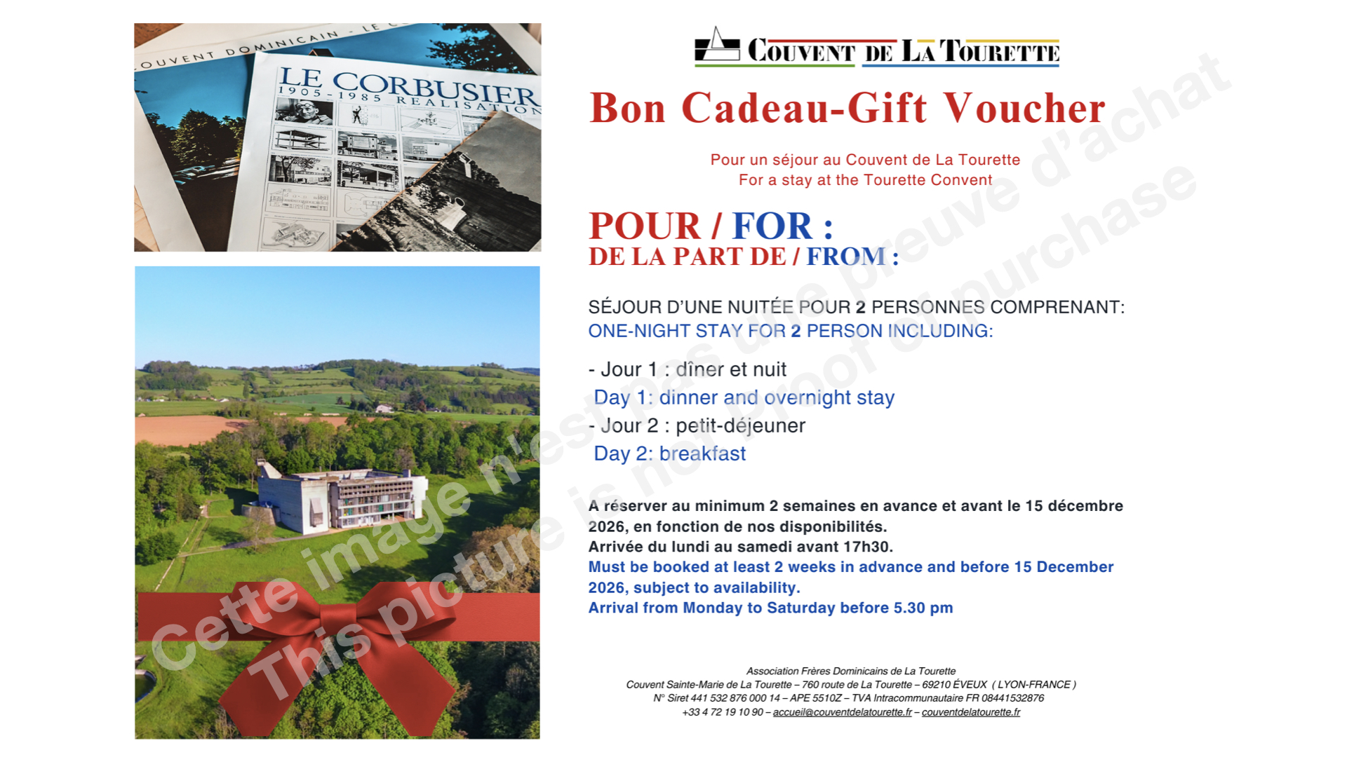 Bon Cadeau pour un séjour au Couvent de La Tourette : 1 dîner, 1 nuit avec petit-déjeuner pour 2 personnes | Gift voucher for a stay at the Couvent de La Tourette: 1 dinner, 1 night with breakfast for 2 people